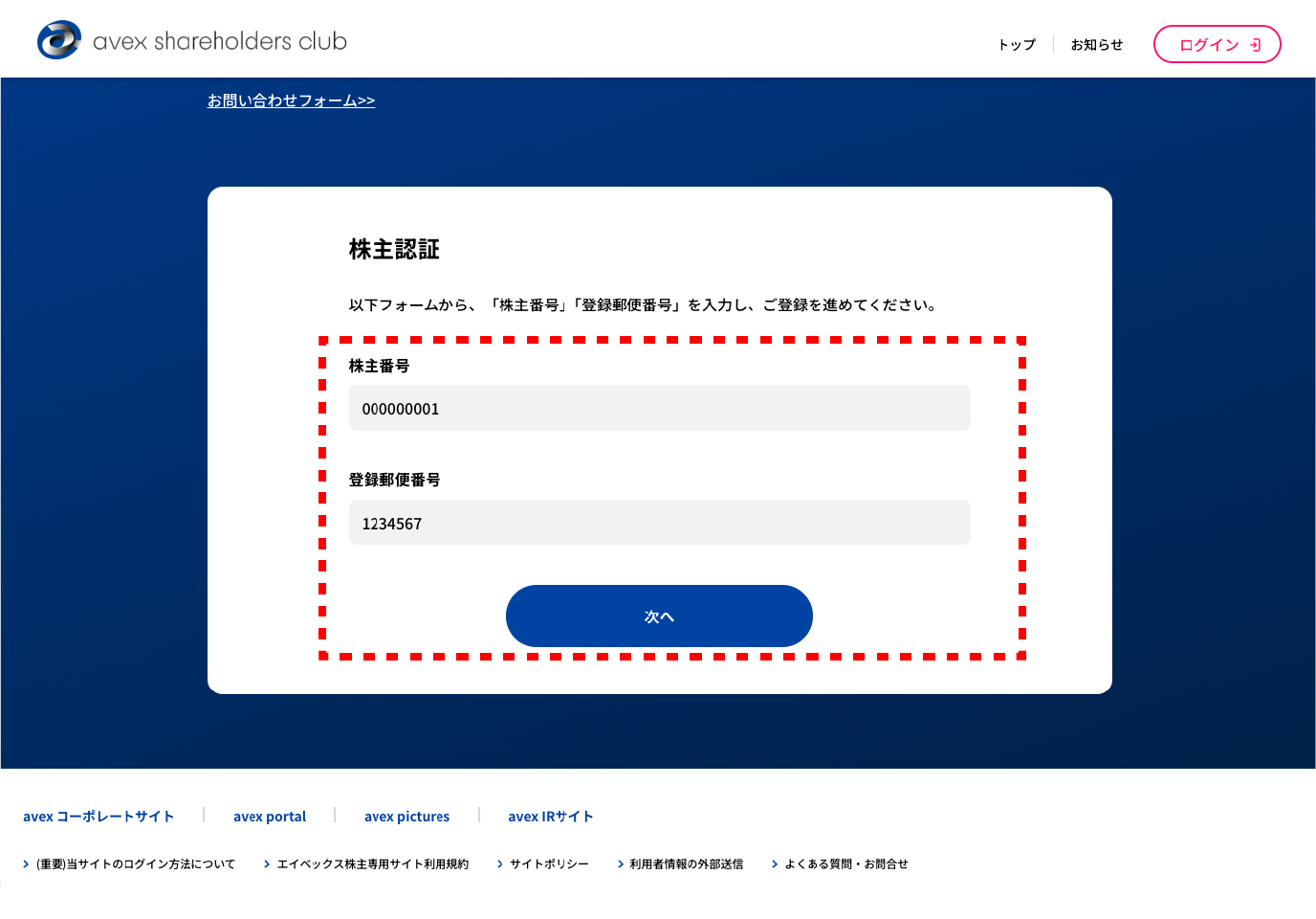 ご利用条件等をご確認の上、株主番号と株主様の郵便番号をご入力いただき、認証を行います。